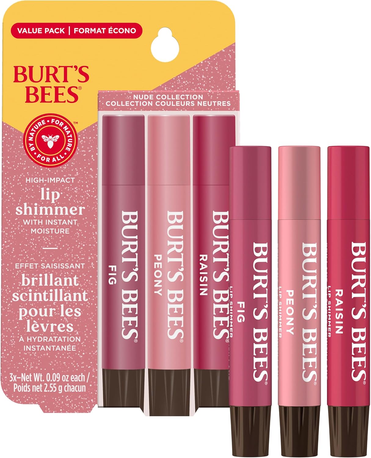 Burt’s Bees Lip Shimmer Nude Collection, Tinted Lip Balm Stick, Moisturizing for All Day Hydration with Natural Glowy Pigmented Finish & Buildable Color, 3 Warm Shades; Value Pack, 3 Tubes x 0.09 Oz
